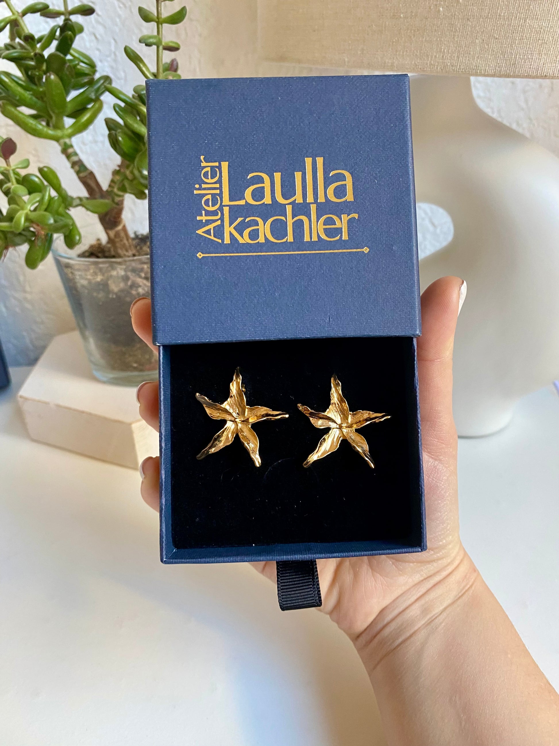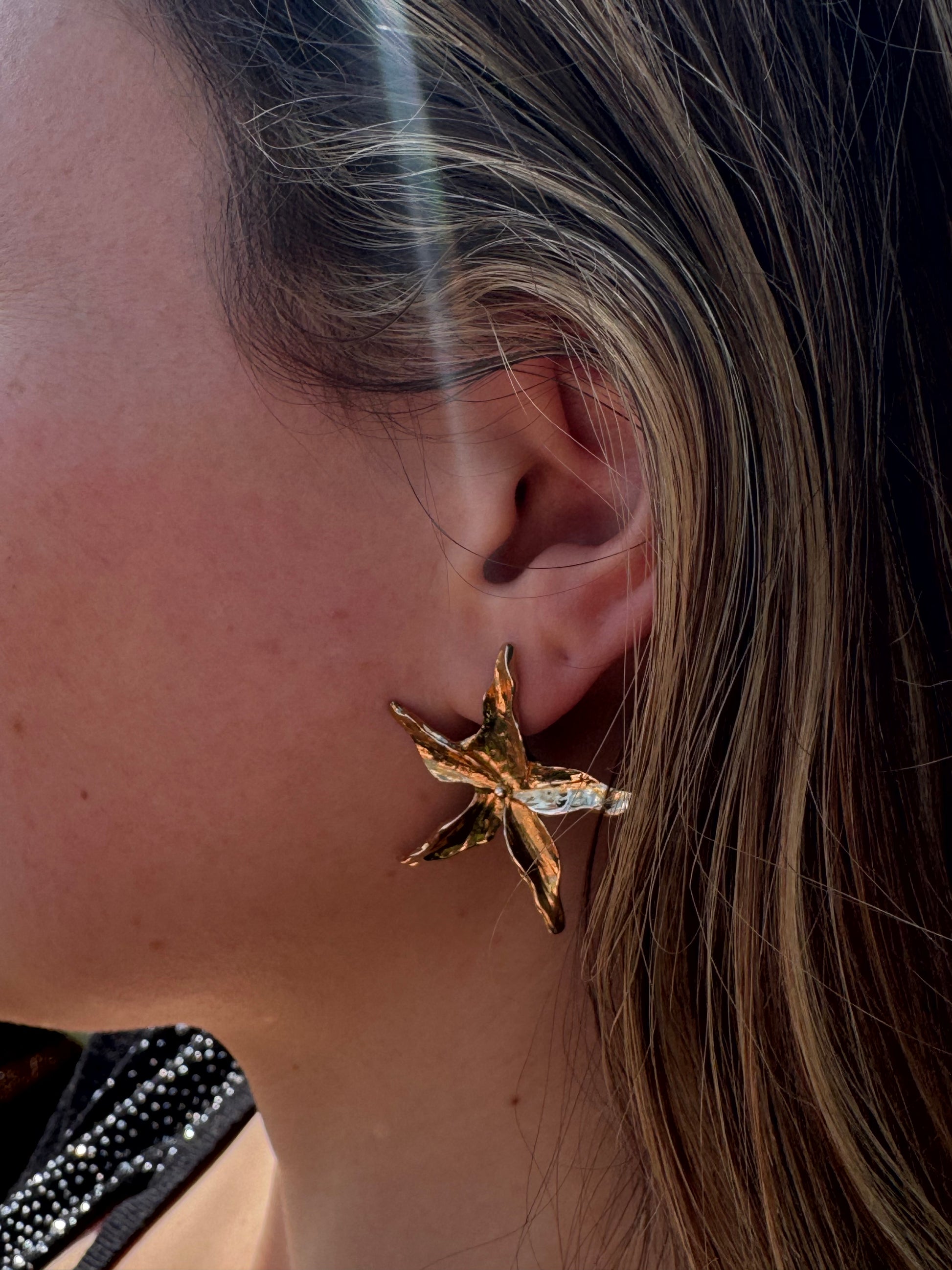 Ces boucles d’oreilles en plaqué or capturent un instant suspendu — celui où la nature ne se laisse plus définir. Ni tout à fait fleur, ni tout à fait étoile.